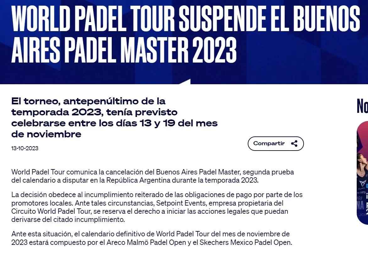 World Padel Tour comunicó ayer la suspensión del Master de Buenos Aires que debía disputarse entre el 14 y 19 de noviembre próximo, a raíz del «incumplimiento reiterado de las obligaciones de pago por parte de los promotores locales», según lo difundido por la organizadora del circuito de manera oficial.